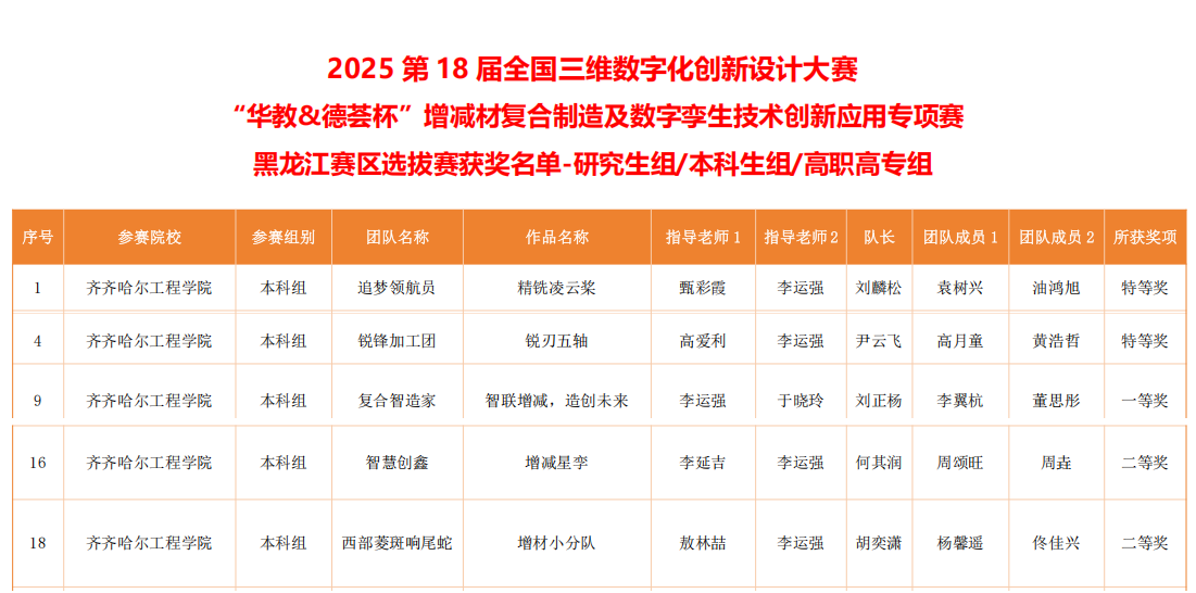 近日,2025年第18届全国三维数字化创新设计大赛“华教&德荟杯”增减材复合制造及数字孪生技术创新应用专项赛黑龙江省赛传来喜讯,我校机电学院机械专业的5组参赛队伍中刘麟宋、袁树兴、油鸿旭组和尹云飞、高月童、黄浩哲组获特等奖并进入国赛;刘正杨、李翼杭、董思彤组获一等奖;何其润、周颂旺、周垚组和胡奕潇、杨馨遥、佟佳兴组获二等奖,参赛队伍全员获奖。